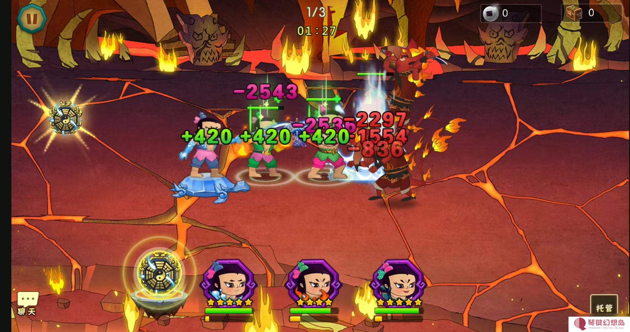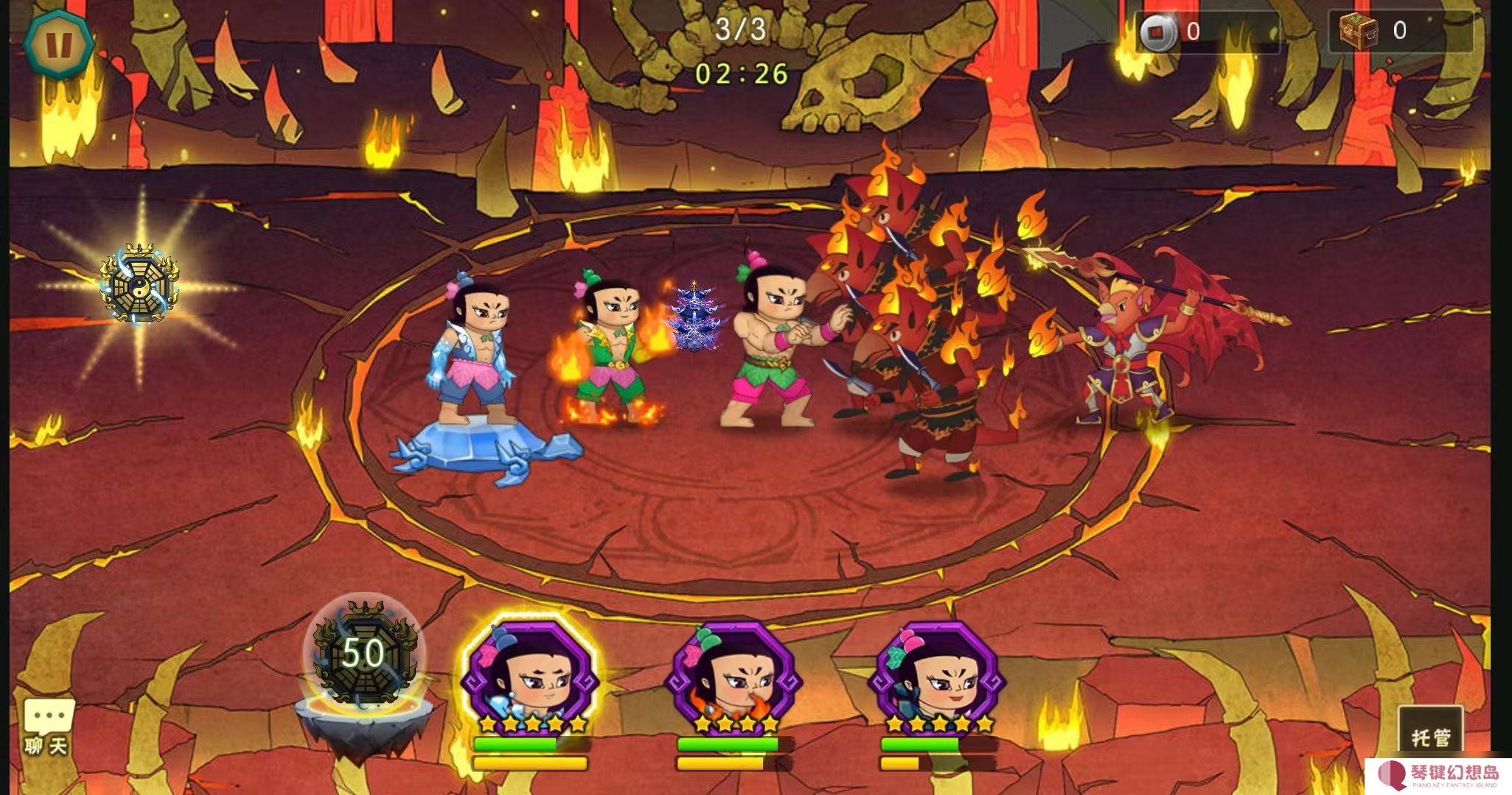 共两个火焰飞刀魔鼠,无额外支援,开局应选择手动八卦,优先速战阶段;这两个火焰飞刀拥有极高伤害,前期后排主力难以承受,务必尽早将其击败以进入第二阶段。同时,在最后一关时注意通关速度,避免五名娃娃的能量被浪费。