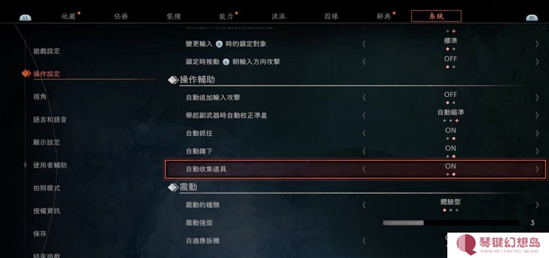 在操作设定里面把自动收集道具打开,这样在搜集物品的时候,就不用按键去拾取物品。